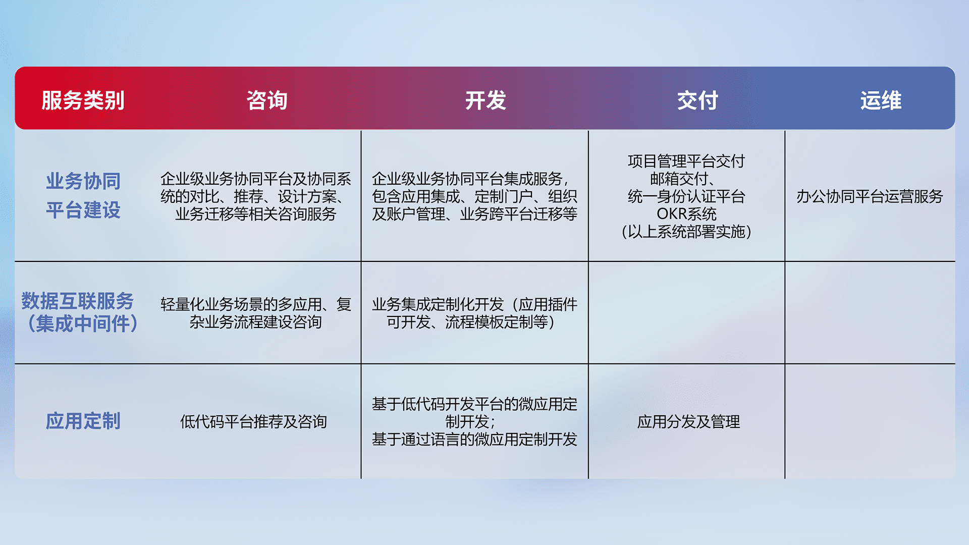 针对钉钉、、、、企微、、、、IDaas等平台级产品提供产品的规划、、、方案、、交付、、定制化开发等服务,,实现如统一协同办公、、、、智能客户服务、、、混合会议管理、、、智能数据查询、、、、等业务场景,,,实现数字化转型。。。。